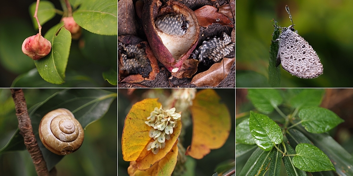 | 2025年11月2日 前回に引き続き知尾方面へ。あい変らずいつもの場所なのだが、少しづつ晩秋らしい賑やかさになってきた。天気は予報と違って薄曇り。海沿いの山道を散歩していると、くたばりかけた往生際の悪いスズメバチが未練がましく路上でもがいている。日陰の草には朝露に濡れた水滴だらけのシジミチョウ。山は少しづつ色づいてきているが、それは生命の終焉の色でもある。冬ももう間近。何だか例年になく短い秋、そして晩秋である。 | ||